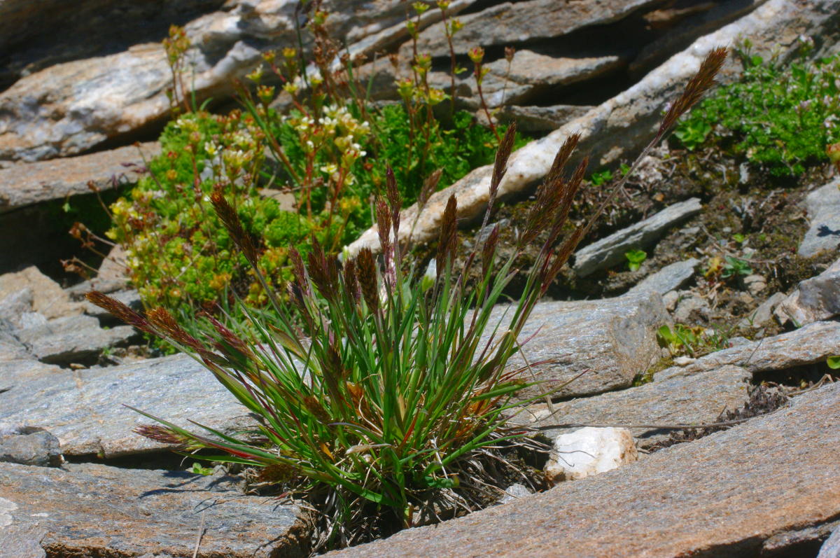 Le trisète en épi (Trisetum spicatum subsp. ovatipaniculatum) est un adepte des milieux pierreux de haute altitude, avec une floraison spectaculaire mêlant vert, rouge et jaune doré.