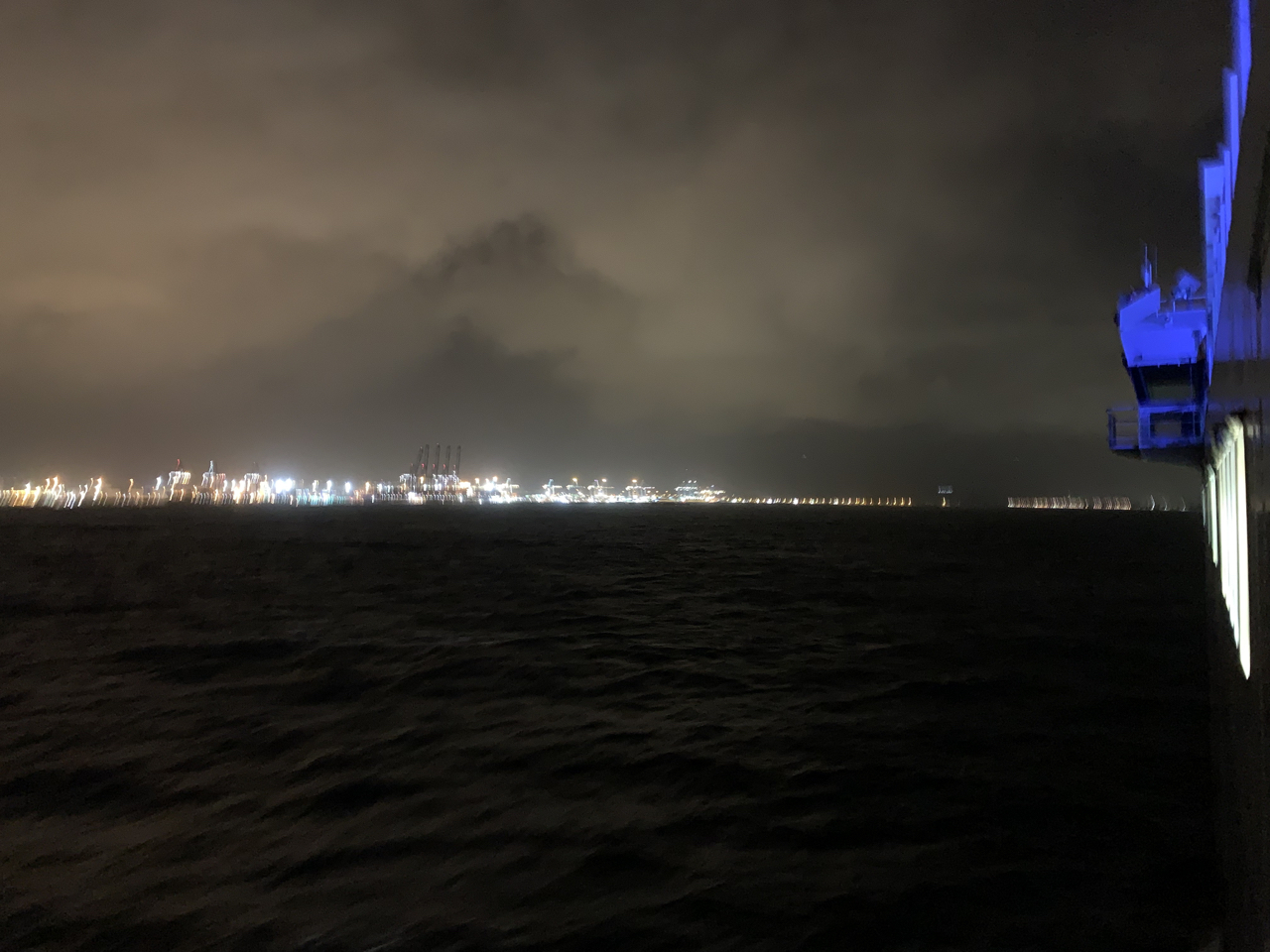 après la traversée mouvementée du détroit de Gibraltar sous 45 noeuds , les lumières du port d'Algéciras apparaissent enfin !